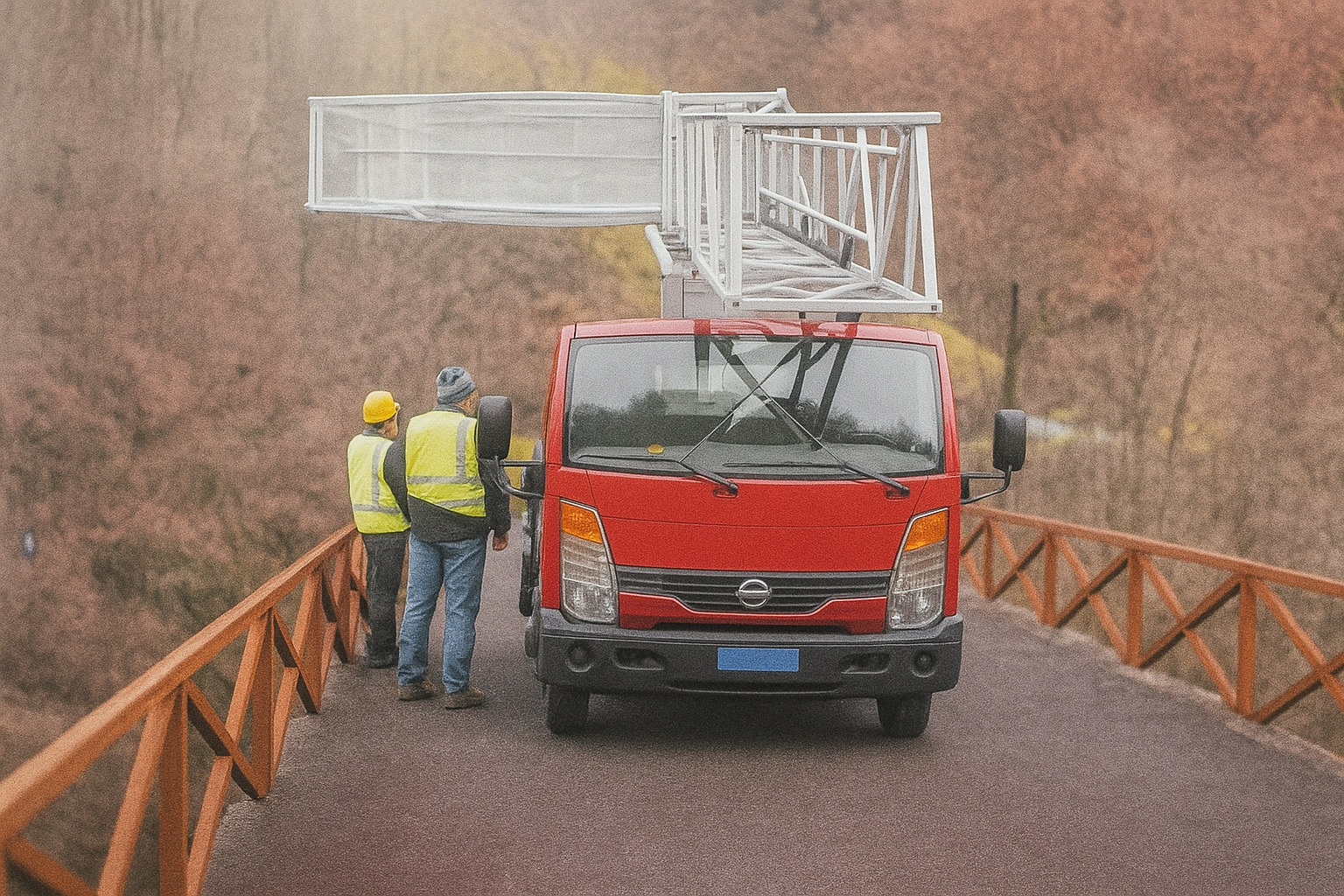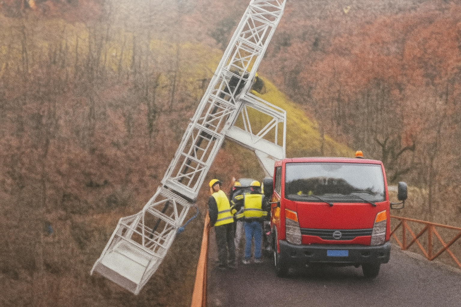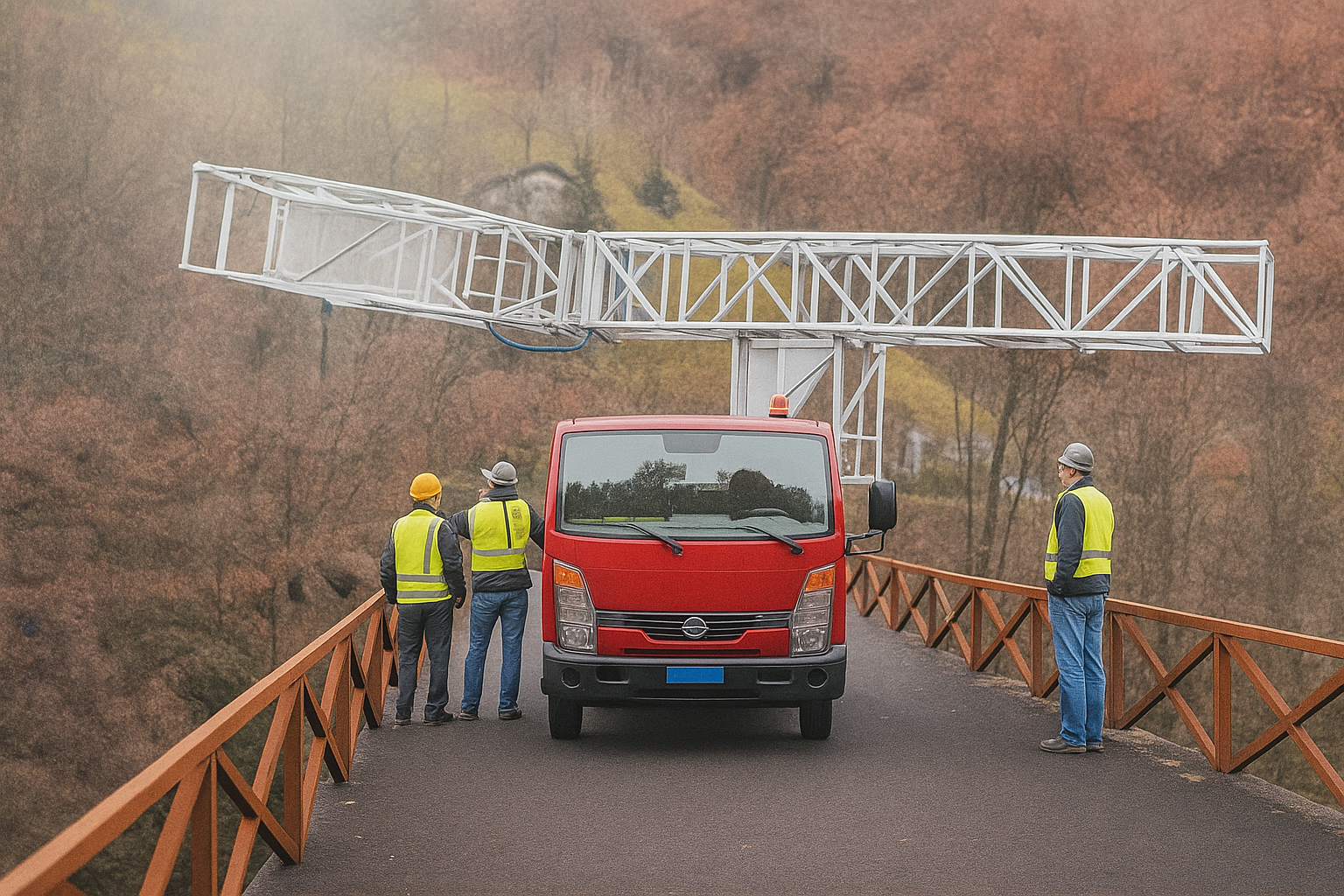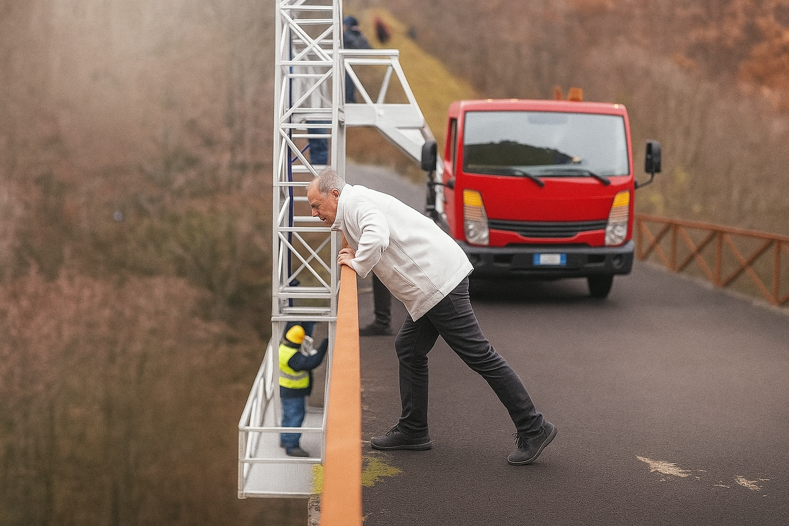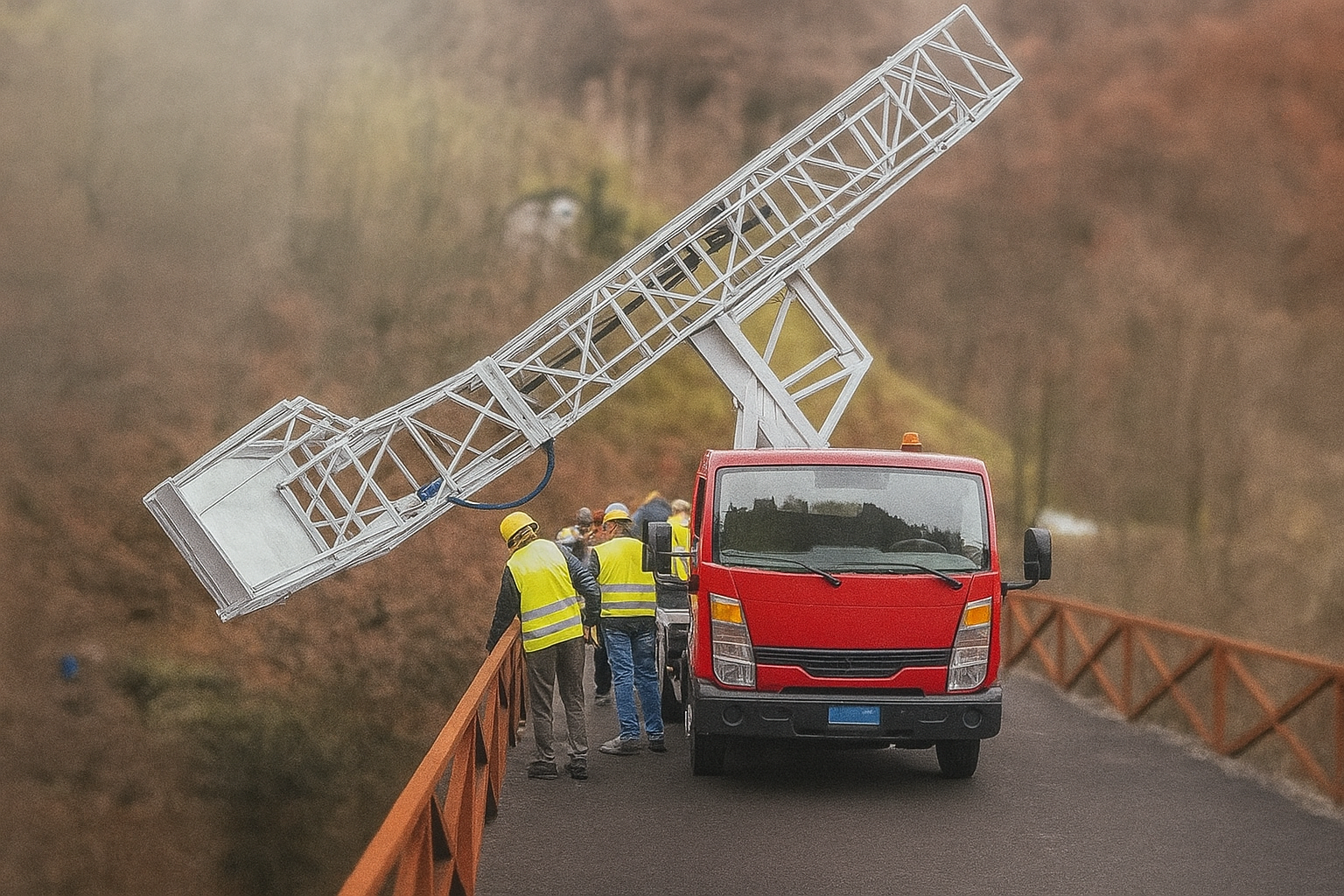 La piattaforma superiore viene estesa lateralmente rispetto al veicolo, mediante comandi idraulici controllati. L’operazione richiede precisione per garantire che la struttura si allinei perfettamente con il parapetto o il bordo del ponte, consentendo la successiva rotazione verso il basso.