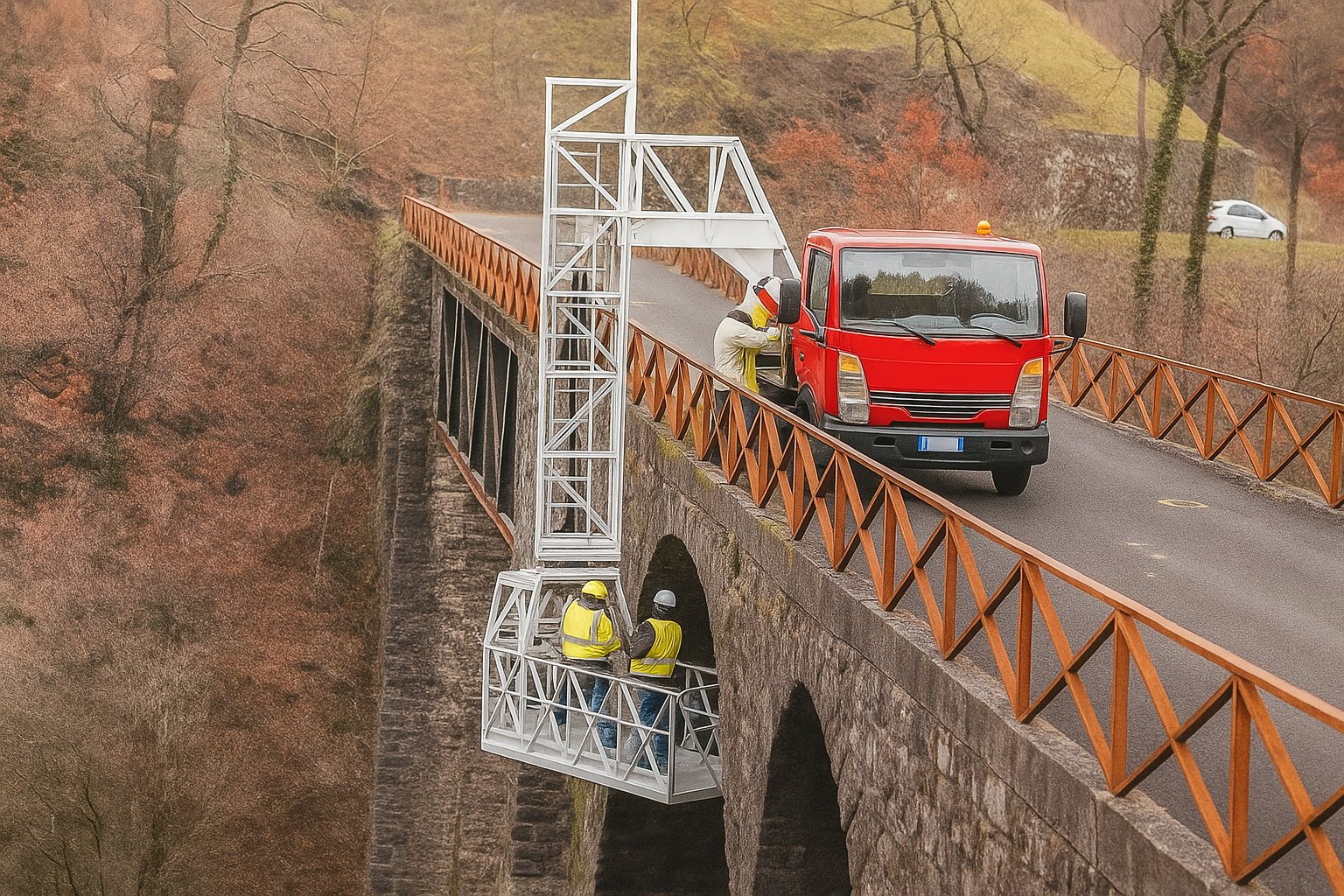 Il veicolo attrezzato viene collocato sul ponte in prossimità dell’area da ispezionare. Il personale tecnico verifica la stabilità del terreno e posiziona i sistemi di sicurezza e segnalazione. Questa fase è fondamentale per garantire che le operazioni successive si svolgano in completa sicurezza.